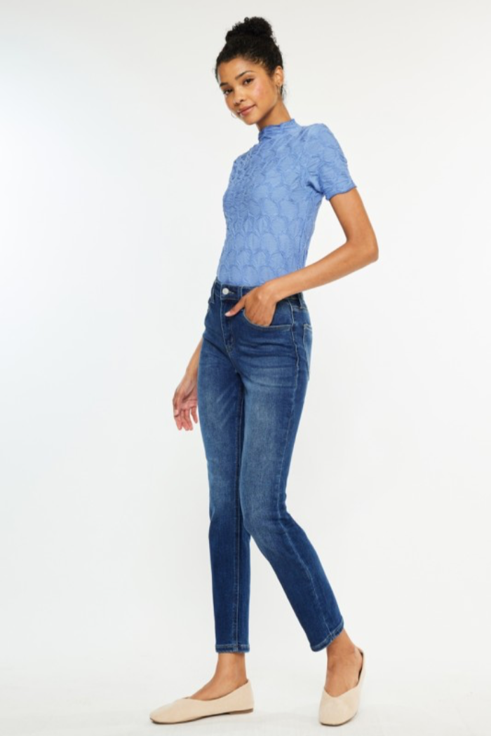 These midwash denimJeans are a essential with a high-rise waist and a slim, straight leg that hits at the ankle. These jeans have a classic five-pocket styling and a medium-dark indigo wash that wears easily from day to night. Pair them with flats or heels for a versatile casual-to-polished look.