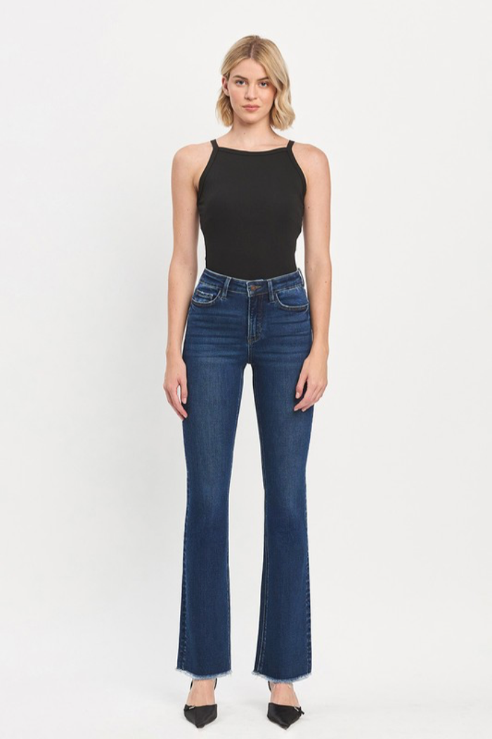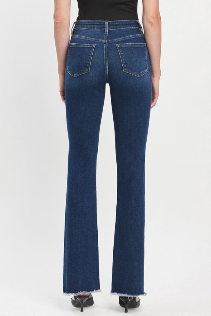 These Raw Hem Boot Cut Jeans are a high-rise denim with a subtle raw edge that lengthens the leg. The silhouette sits fitted through the thigh and opens to a classic bootcut flare at the hem. They are made in a dark indigo wash ideal for everyday styling. Pair with heels or flats for a polished casual look