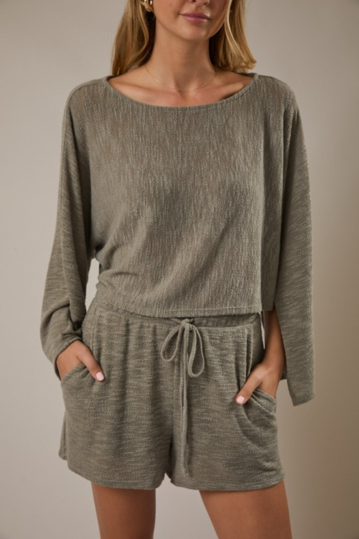 This two-piece shorts set is a must add to your wardrobe. The shirt has a boat neckline, slit long bell sleeves and a boxy fit. The shorts have an elastic waistband with a functional drawstring and side pockets.