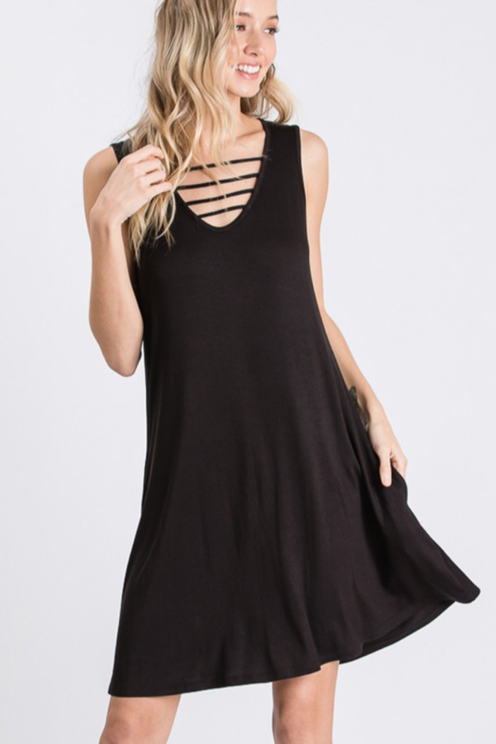 Sleeveless v neck dress with a bar detail and side pockets. Great casual dress to pair with wedges or flip flops.
