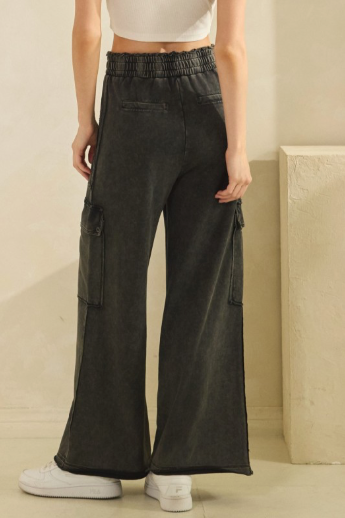 Relaxed, mineral-washed utility pants with a wide-leg silhouette and cargo pockets for an easy, lived-in look. The Mineral Washed Utility Pants feature an elastic high-rise waist and panel detailing that add structure to the soft washed fabric. Pair them with a fitted tank or chunky sneakers for casual weekend wear.