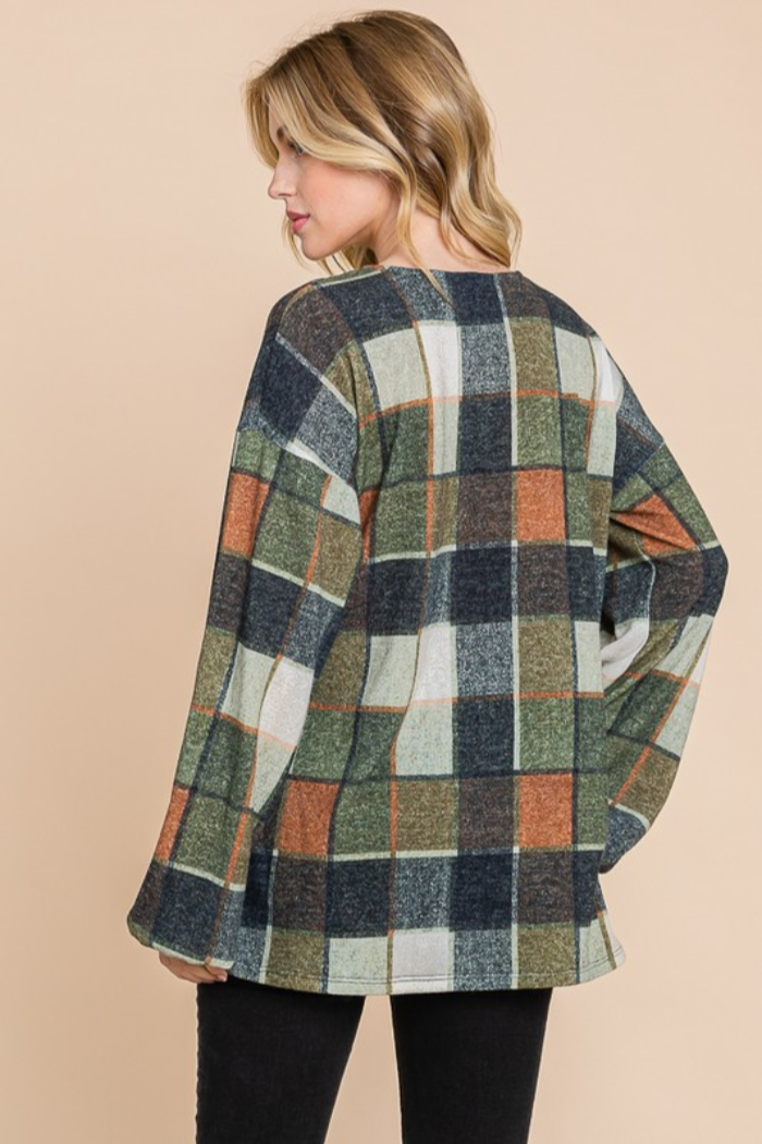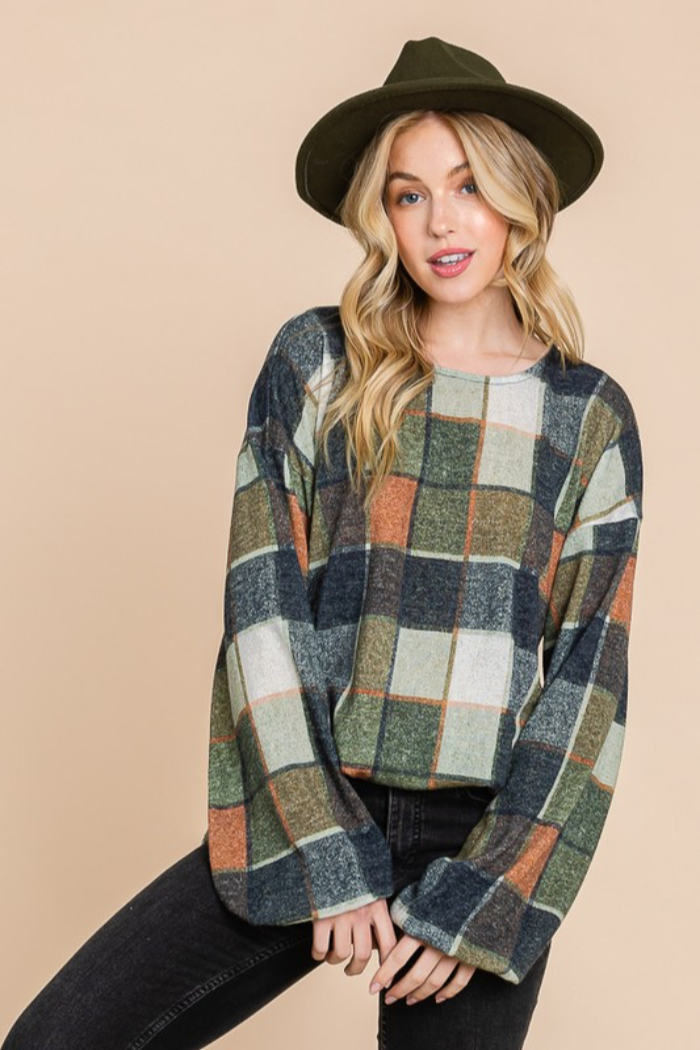 This adorable top features long balloon sleeves with elastic around the cuff, a crew neck line and a plaid print all over.