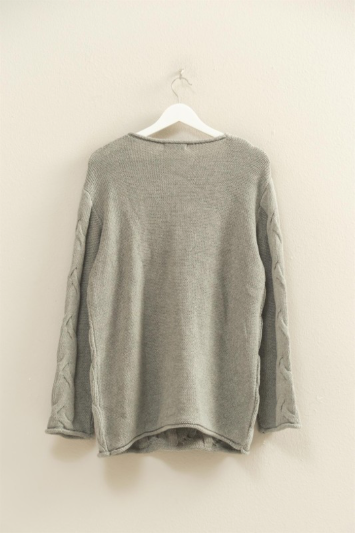 A cozy cable-knit sweater with a flattering V-neckline and relaxed fit. This sweater is crafted in a chunky knit with classic cable detailing that adds texture and warmth. Long sleeves and a slightly oversized silhouette make it perfect for casual days or lounging at home. Pair it with denim or leggings for an effortless, comfortable look.