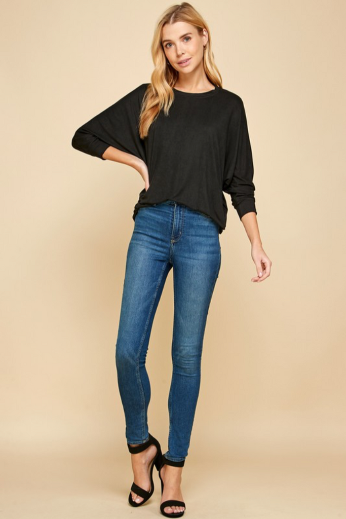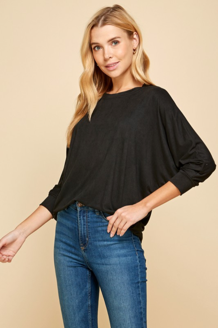 A relaxed Dolman Top with a roomy batwing silhouette and a classic crew neckline for effortless layering. The drapey, soft-feeling fabric and cuffed sleeves make it an easy everyday piece. Pair this top with jeans or tailored pants for a casual, modern look.