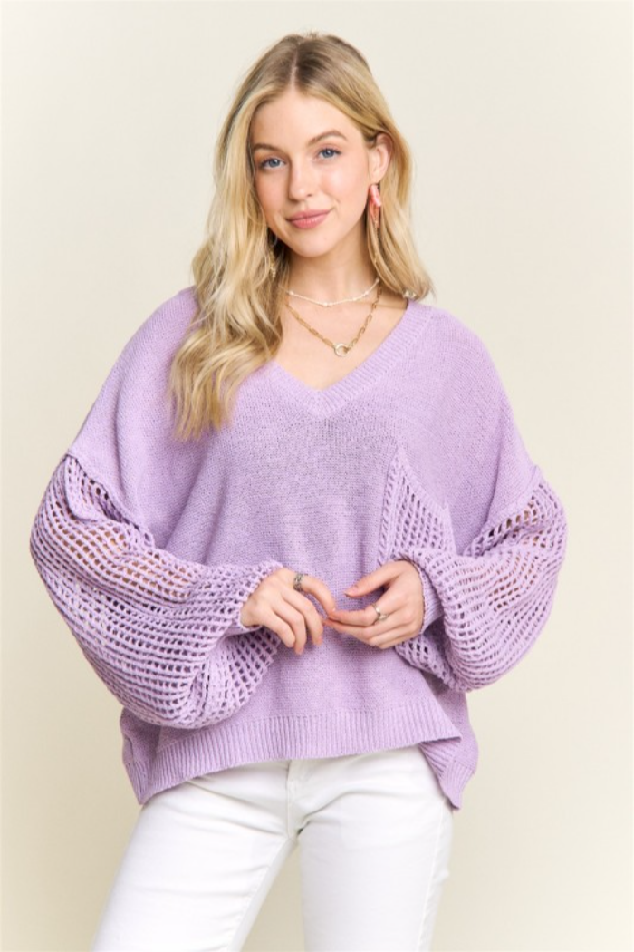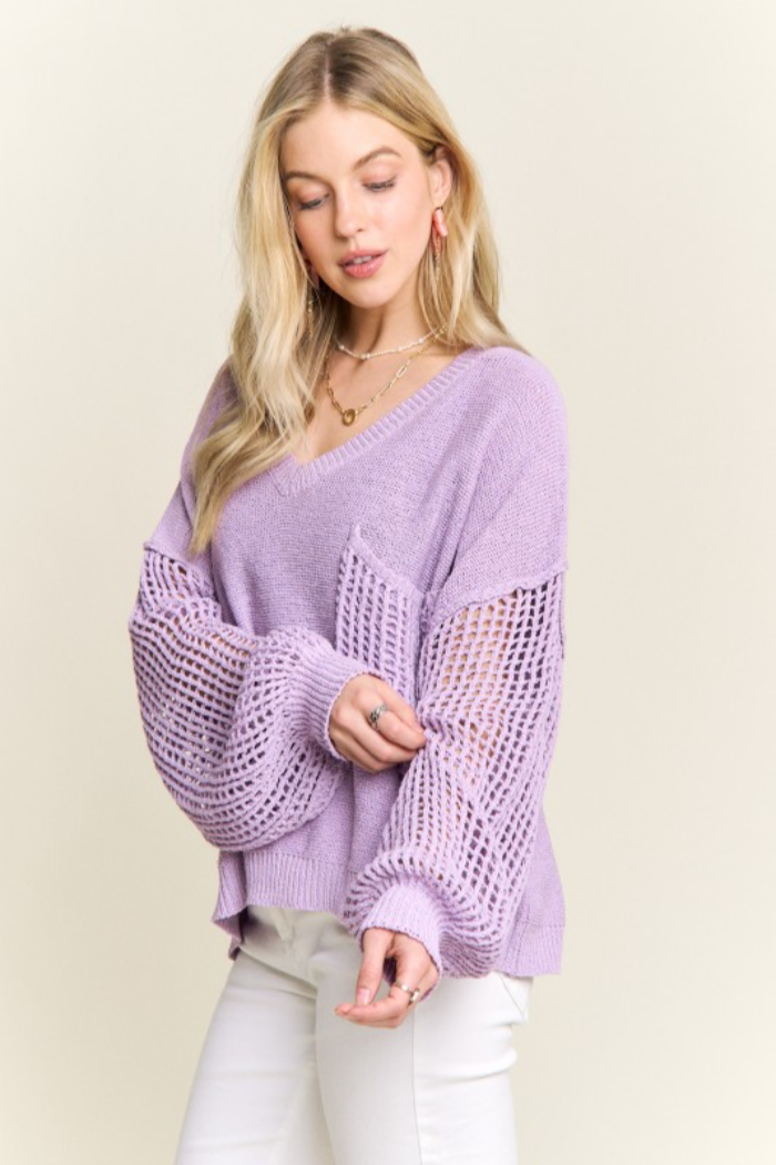 This sweater features a relaxed, loose knit construction with a flattering V-neckline and drop shoulders. The standout design element is the mesh detailing on the sleeves, adding a touch of bohemian flair and breathability. A single chest pocket, also in a mesh knit, echoes the sleeve design, creating a cohesive and stylish look.