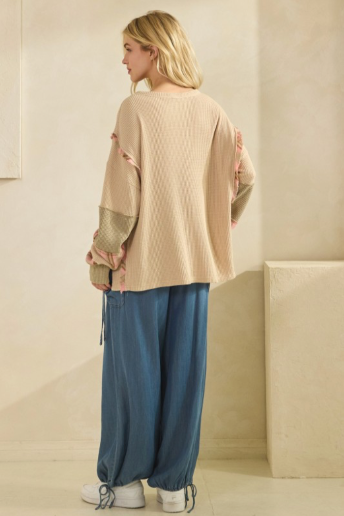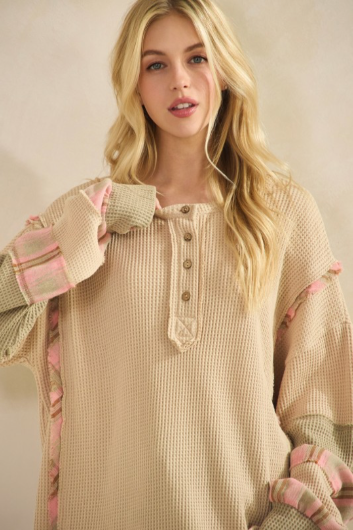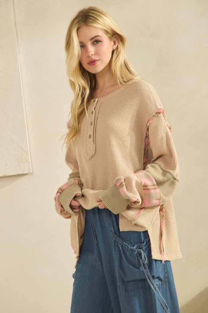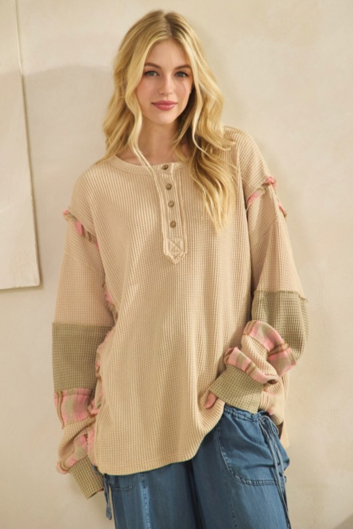 An easygoing waffle-knit henley with patchwork details and a relaxed oversized tunic silhouette. This top features a buttoned placket, long sleeves, raw edge hemline and contrasting fabric panels at the cuffs and seams for a handcrafted look. Wear it as a cozy everyday top layered over jeans or leggings.
