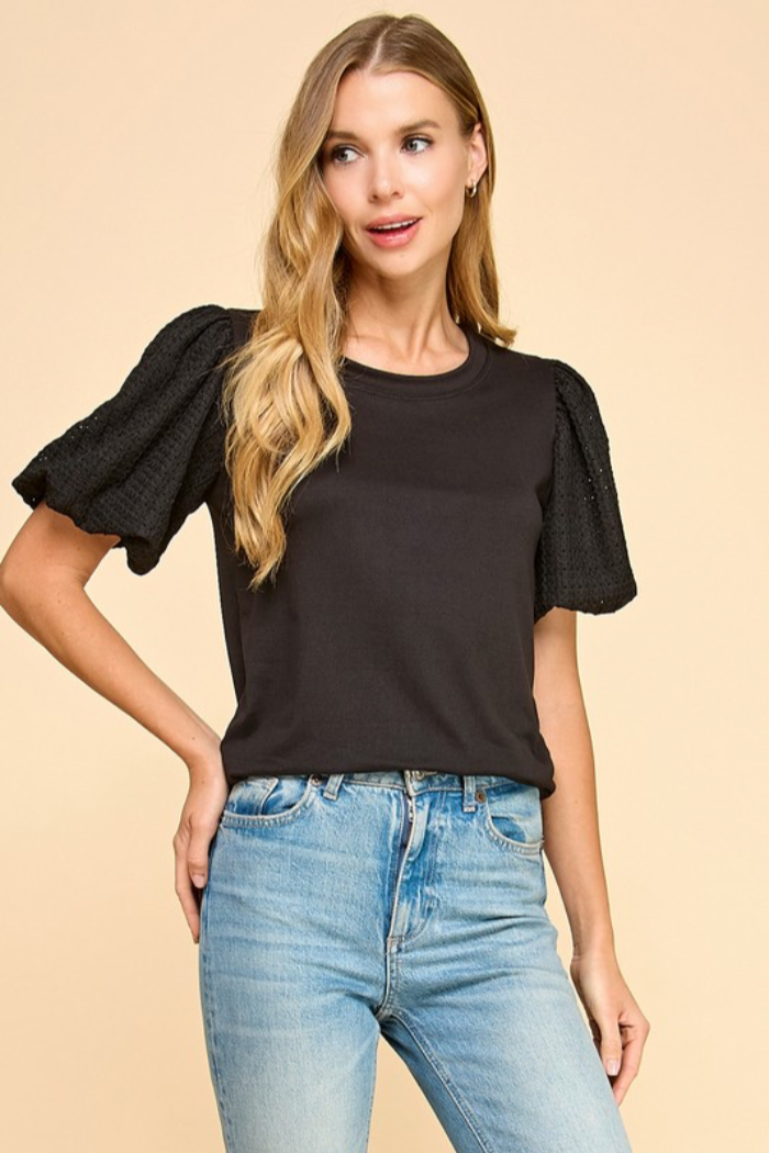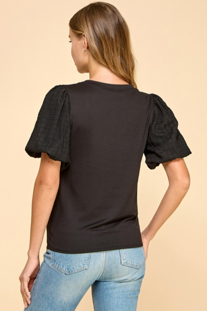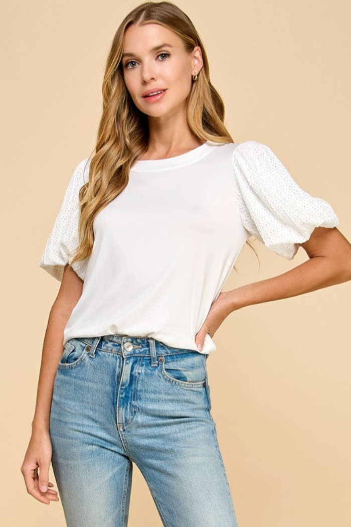 This Puffed Short Sleeve Top balances a simple crew-neck body with voluminous textured puff sleeves for an elevated everyday look. The shirt is desgined with eyelet sleeves that add feminine detail. The shirt runs true to size.