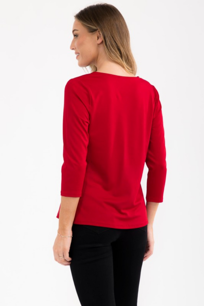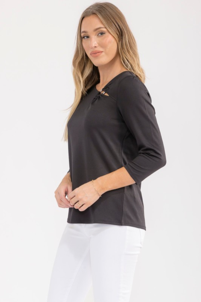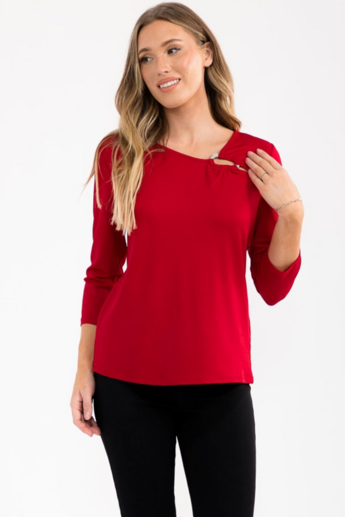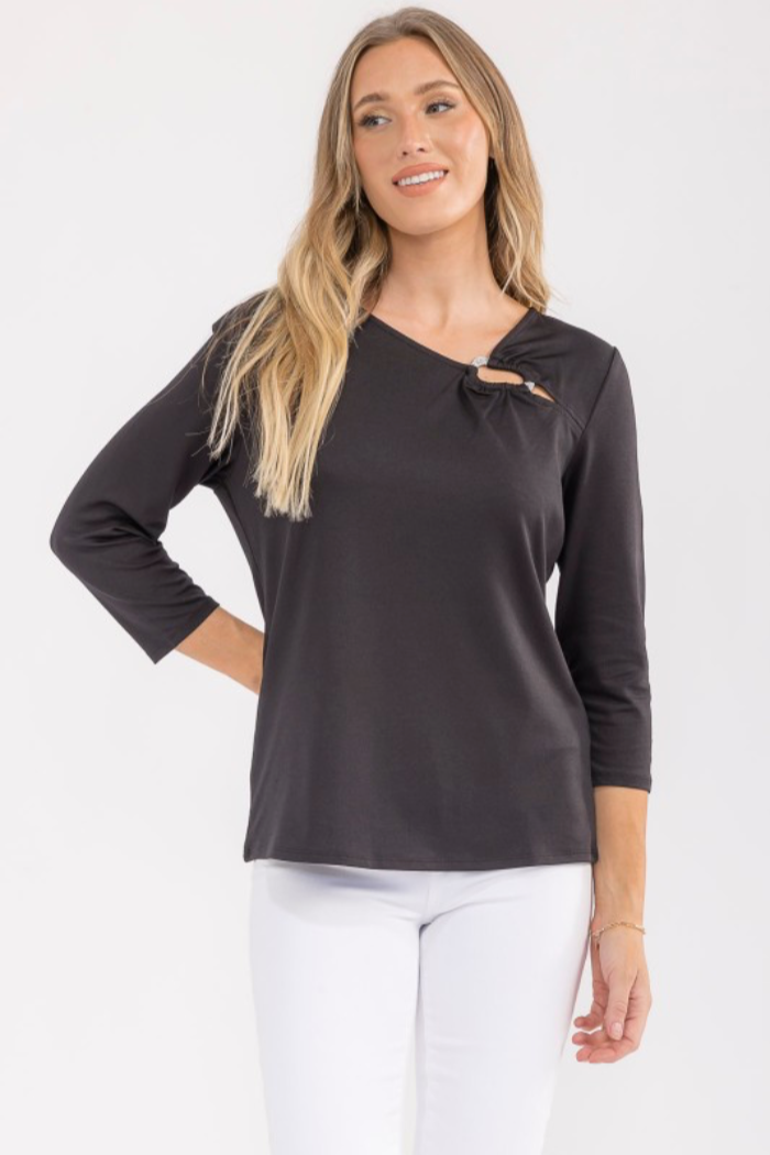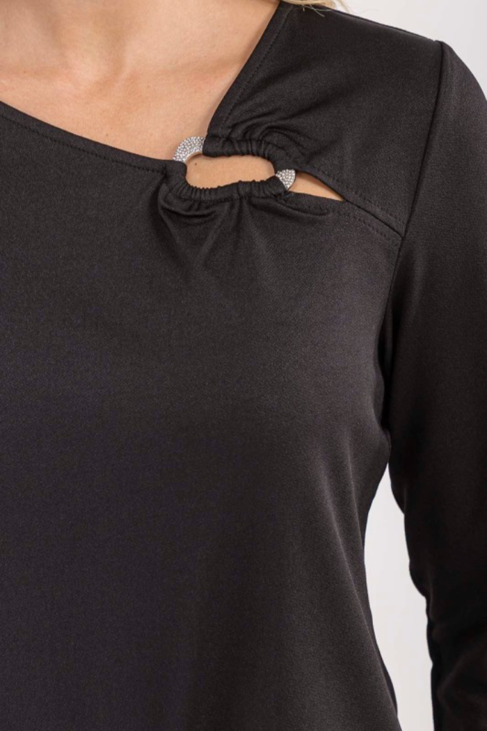 A sleek top with an asymmetric neckline and rhinestone accents that elevate everyday dressing. The shirt is cut from a smooth, drapey knit and features a one-shoulder inspired detail with subtle hardware. Three-quarter sleeves and a relaxed silhouette make it easy to tuck into tailored pants or wear over jeans. Dress it up for a night out or keep it smart for a date night look.