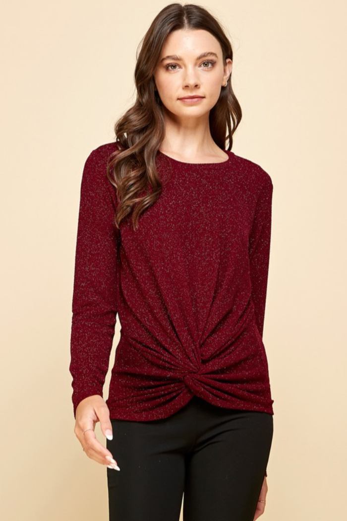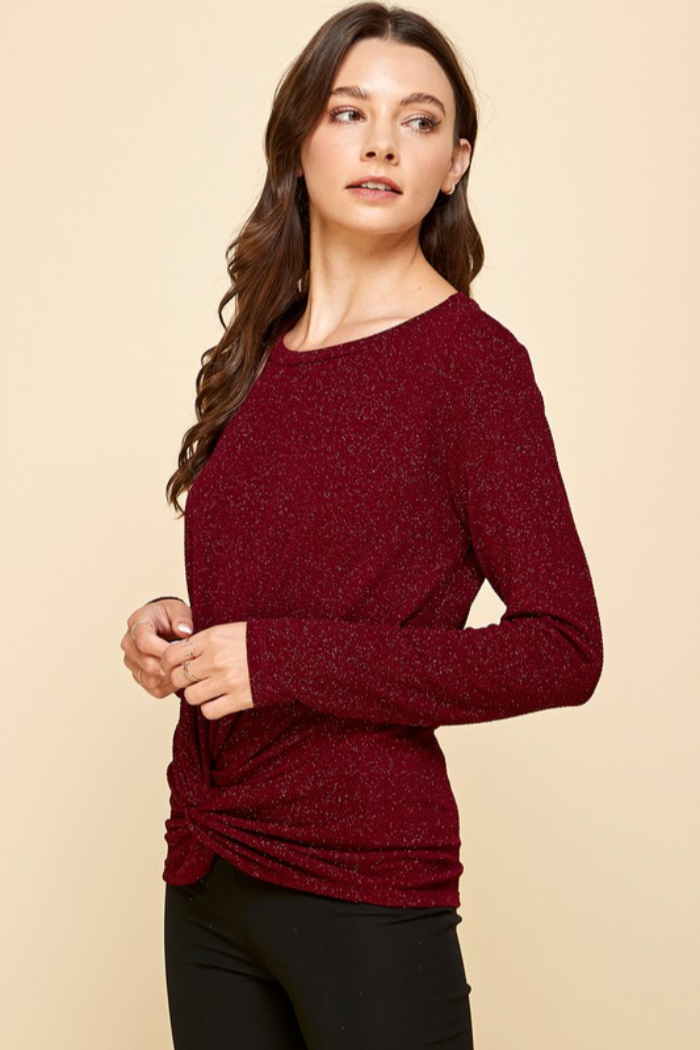 This shimmery front knot top has a touch of sparkle and a relaxed silhouette that elevates casual looks. This Front Knot Top features long sleeves and a crew neckline with a twisted knot detail at the hem. Lightweight, subtly metallic fabric gives it a dressy feel perfect for date nights or evening outings. Pair it with jeans or a skirt for an easy, polished outfit.