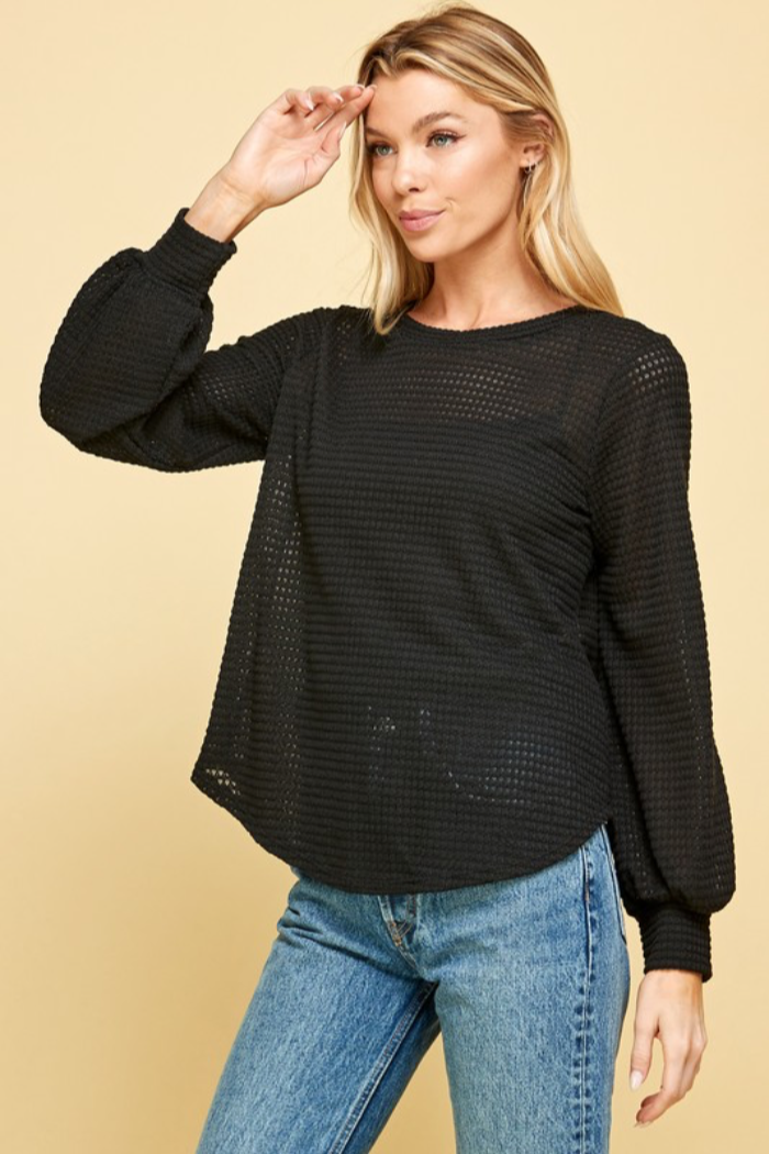 A relaxed waffle knit top with softly gathered puff sleeves and a rounded crew neckline. This top pairs textured fabric with a slightly boxy silhouette for easy, elevated everyday wear. Long sleeves finish with fitted cuffs for subtle volume at the arm. Wear it with jeans or layered under jackets or vests for a casual, modern look.