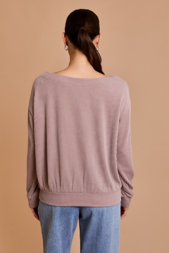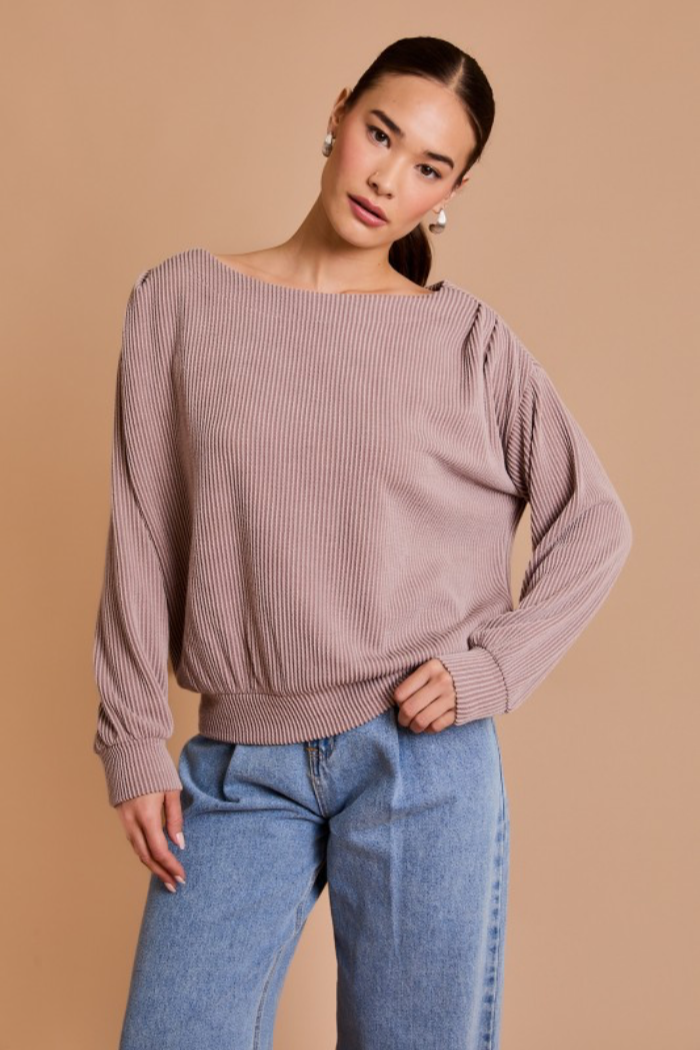 A relaxed, ribbed knit top with a wide boat neckline and long dolman sleeves for effortless polish. This top is cut in a soft, textured knit that skims the body and gathers at a fitted hem for a subtle shape. Wear it with high-rise jeans or tailored trousers for casual weekend looks or low-key office days. The neutral tone and minimalist silhouette make it an easy layering piece