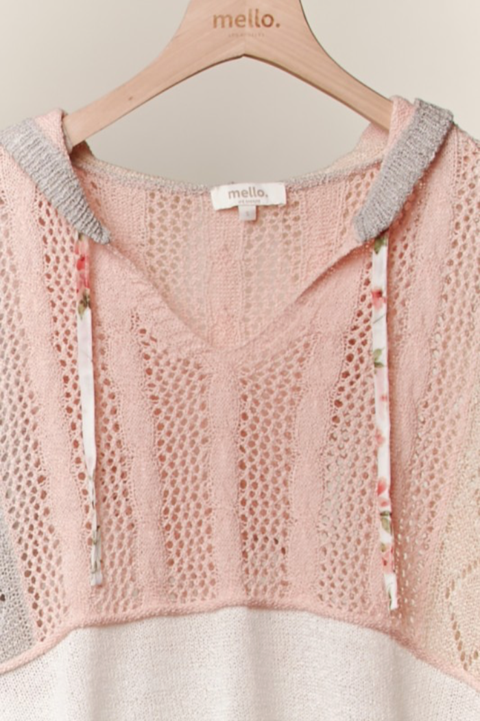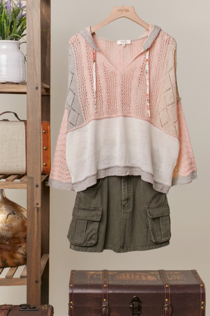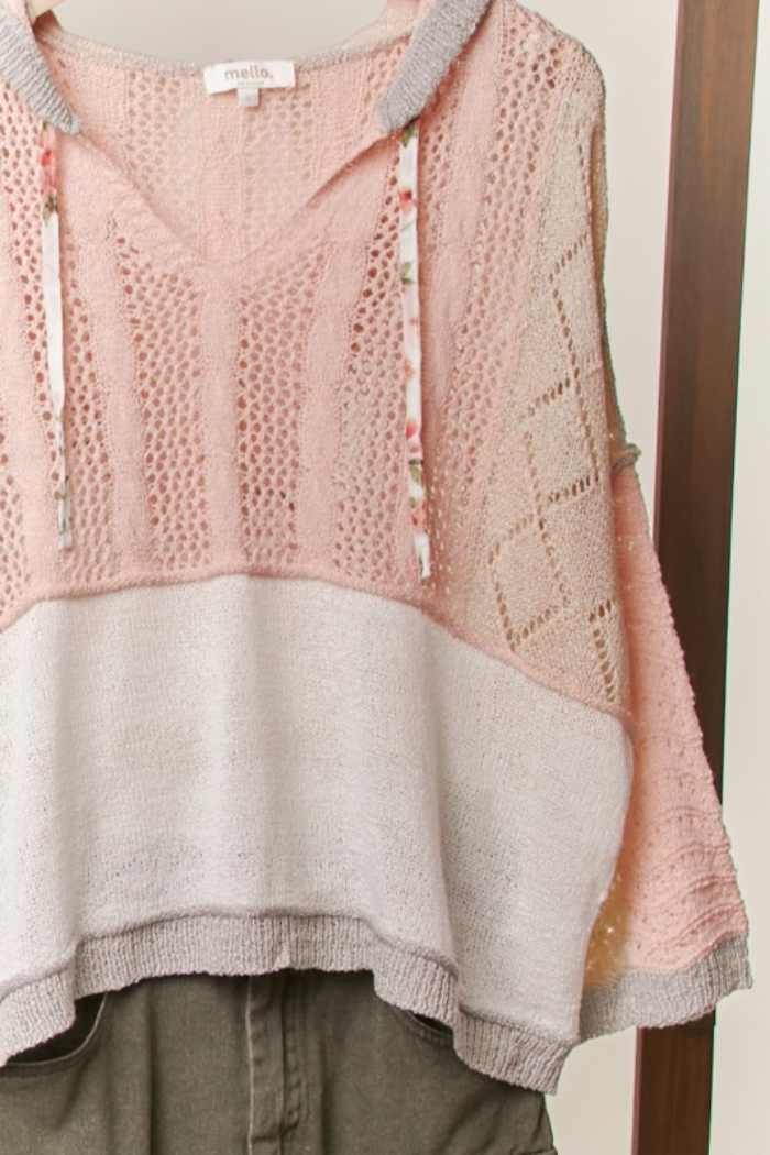 A relaxed fit colorblock crochet knit hoodie with an open, airy stitch and dropped shoulders for an effortless boho feel. This top features a V-neckline, functional drawstring hoodie with floral print drawstrings and bell long sleeves. Perfect transition top for the spring or wear it on a cool summer night