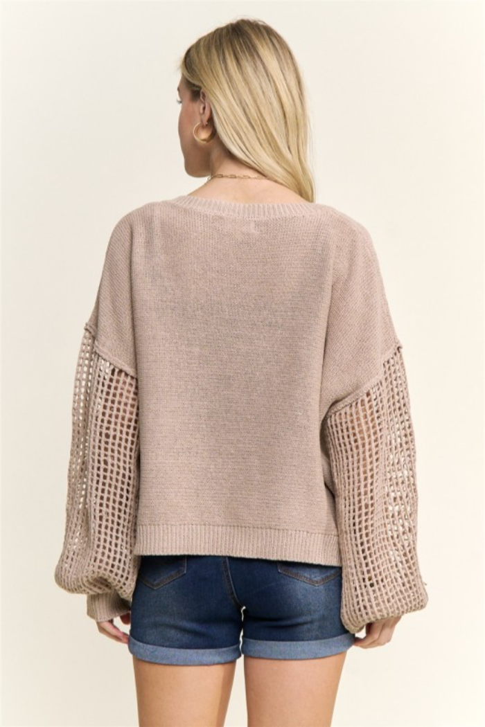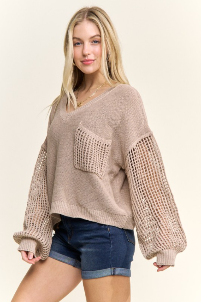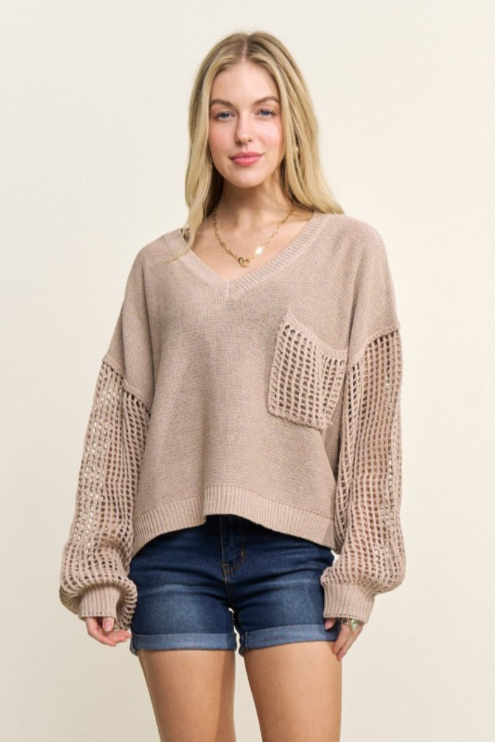 This sweater features a relaxed, loose knit construction with a flattering V-neckline and drop shoulders. The standout design element is the mesh detailing on the sleeves, adding a touch of bohemian flair and breathability. A single chest pocket, also in a mesh knit, echoes the sleeve design, creating a cohesive and stylish look.