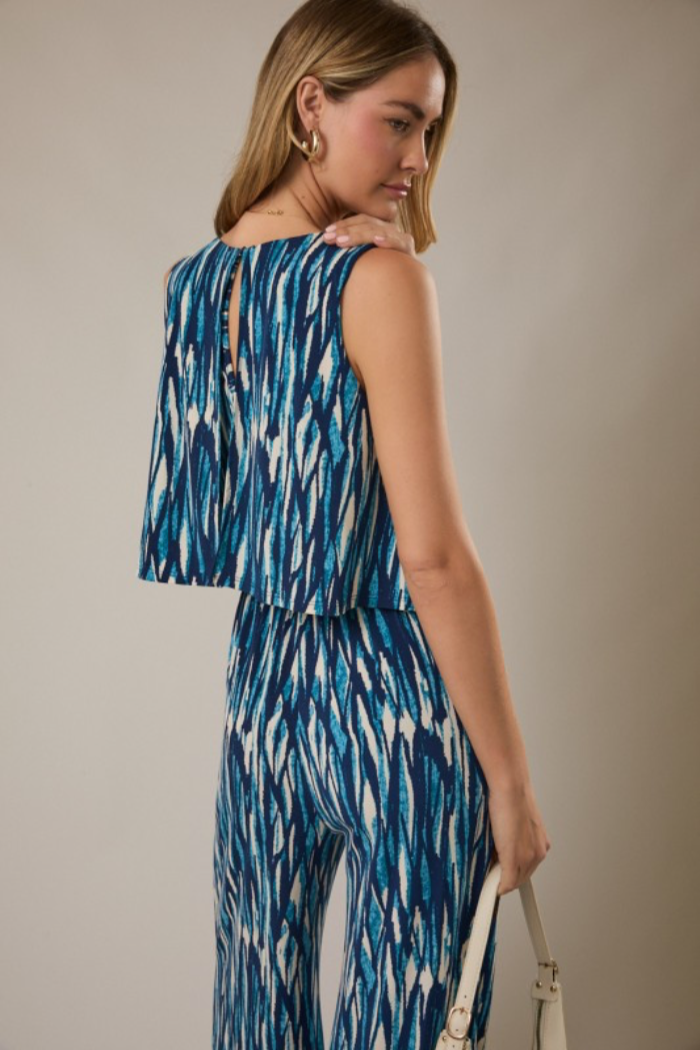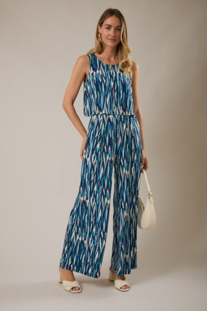 Lightweight and breezy, this Jumpsuit features a sleeveless overlay bodice and flowing wide-leg silhouette in an allover abstract print. This relaxed jumpsuit is cut with a crew neckline and an elasticized waist for easy wear. Perfect for warm-weather weekends or a vacation