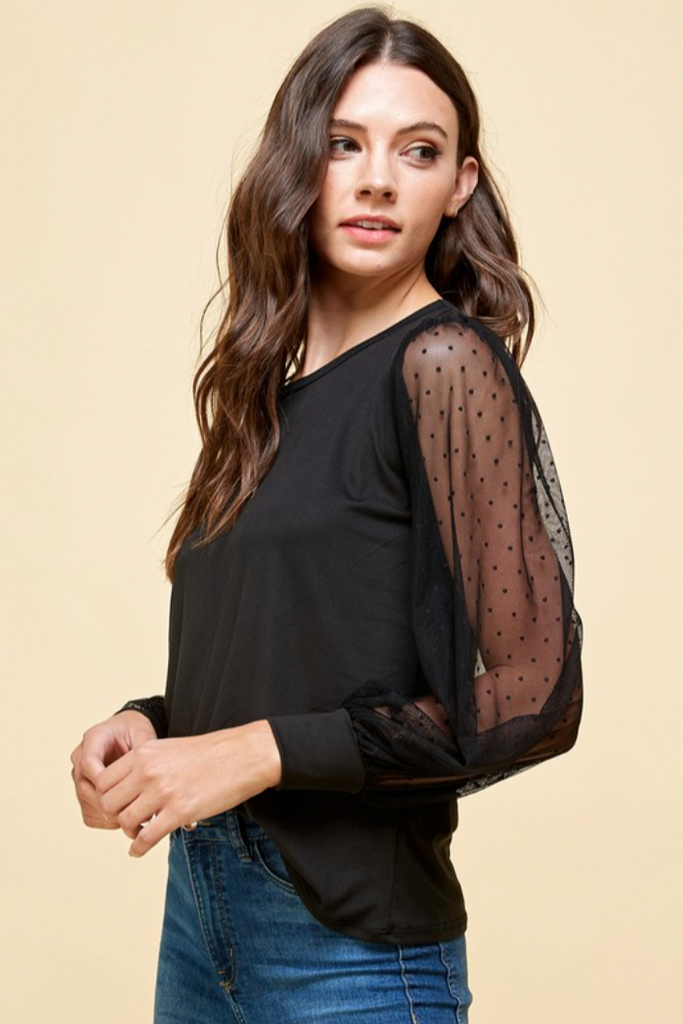 This solid knit top features a rounded neck line and long sheer sleeves with a dot detail. Tight around the cuff.