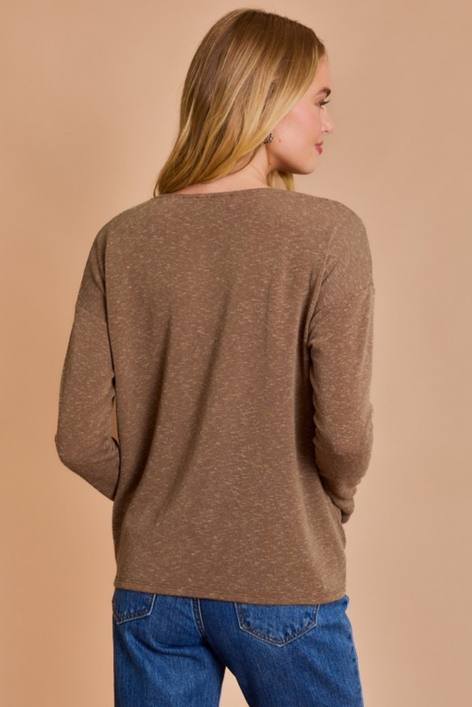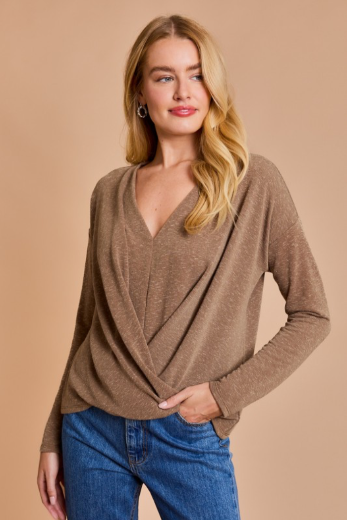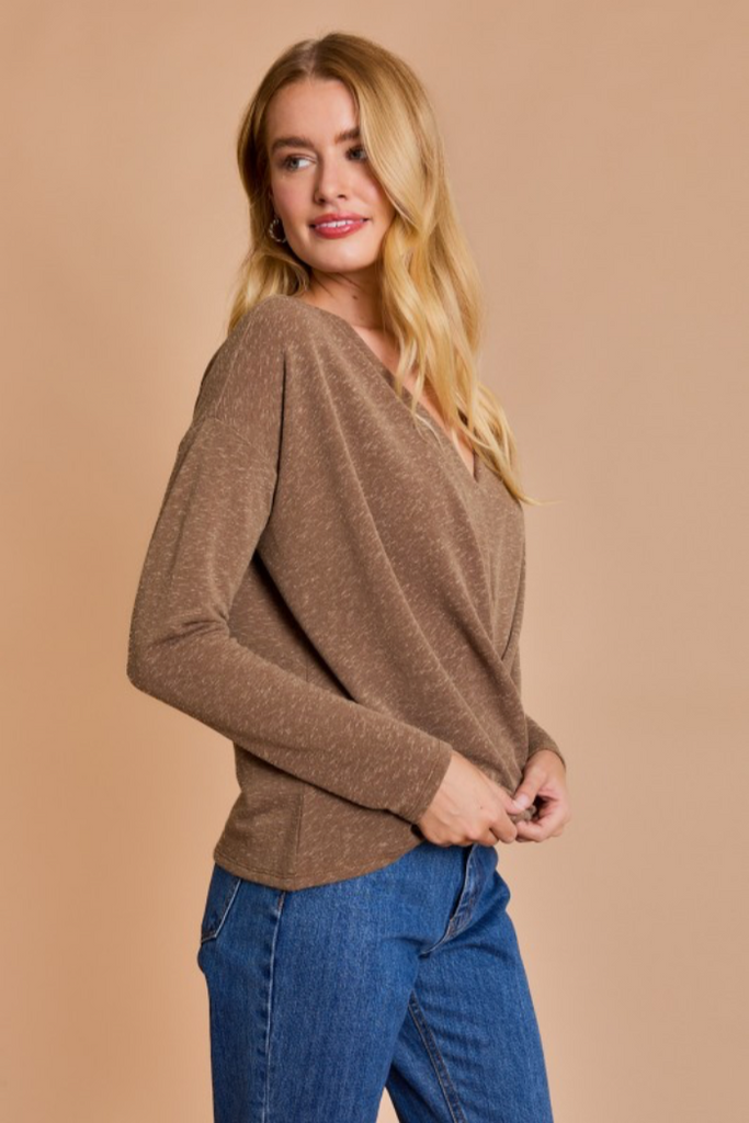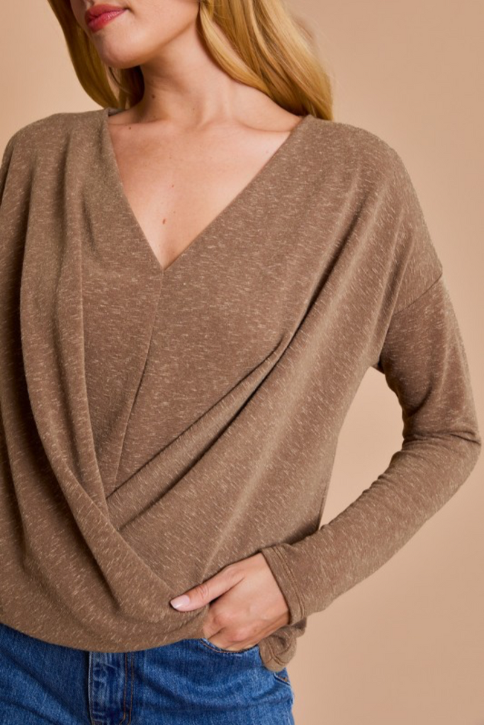 Effortlessly chic, this V Neck Surplice Top features a draped wrap-front silhouette and a soft, slub-knit texture for everyday wear. The long sleeves and V-neckline create a flattering, easygoing profile that layers well under jackets or pairs with jeans. This top was designed for casual days when you want a polished yet relaxed look.