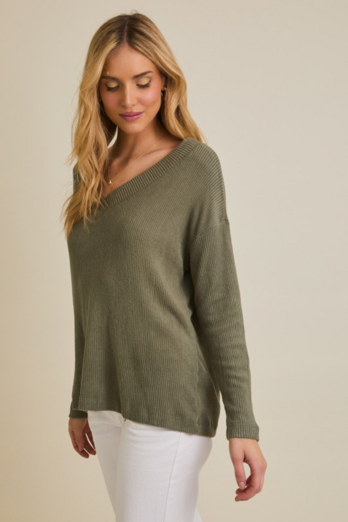 Soft ribbed knit and a relaxed silhouette make this V-Neck Long Sleeve Top an easy go-to for everyday wear. This top has a classic, flattering shape that layers well over jeans or under a jacket or vest.