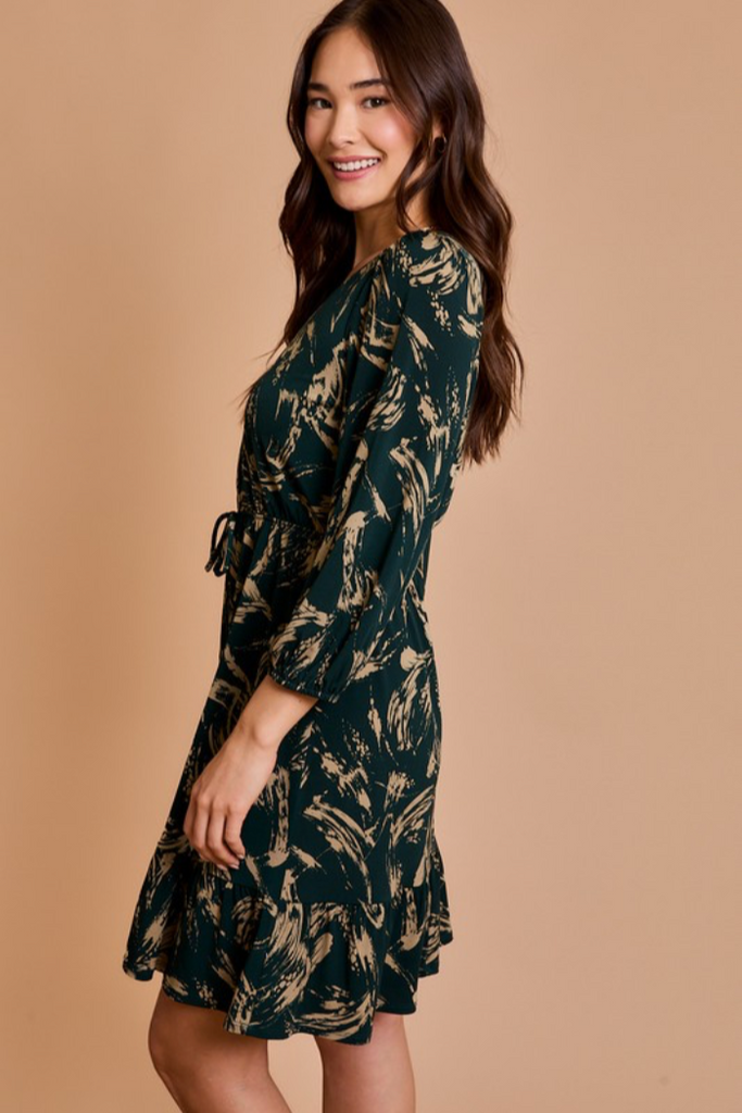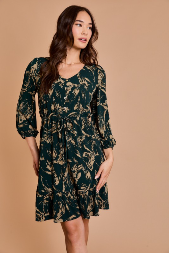 This V-Neck Mini Dress has a defined waist and softly gathered 3/4 sleeves for an easy, feminine silhouette. This dress has a button-front detail that give it a relaxed yet polished feel. The lightweight fabric and tiered skirt create movement, making it a versatile option for daytime outings or weekend plans. Pair it with sandals or ankle boots to complete the look.